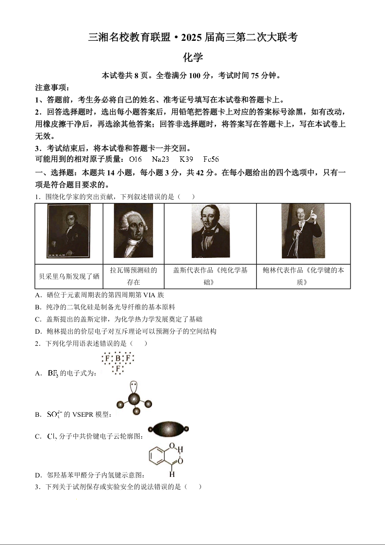 湖南省天壹名校联盟2025届高三高三第二次大联考 化学