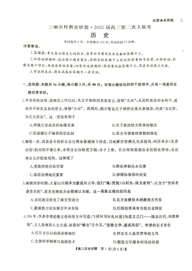 湖南省天壹名校联盟2025届高三高三第二次大联考 历史
