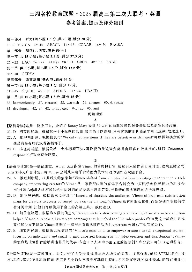 湖南省天壹名校联盟2025届高三高三第二次大联考 英语答案