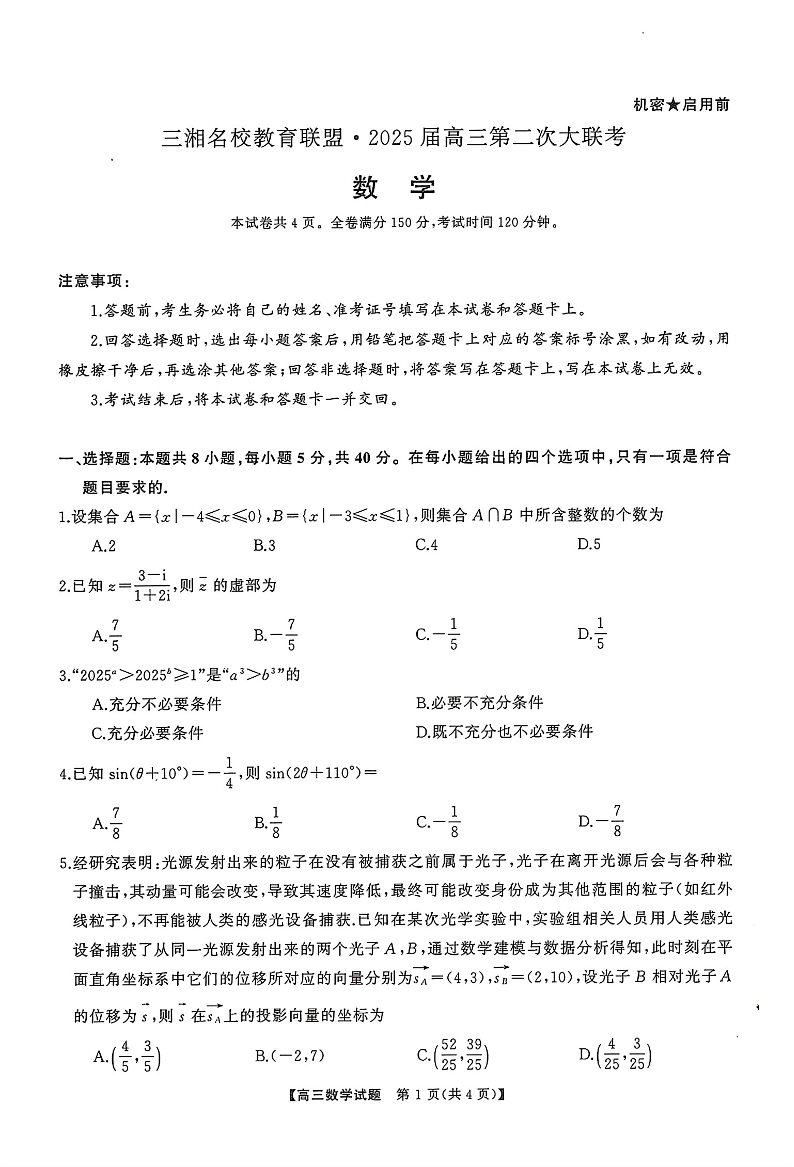 湖南省天壹名校联盟2025届高三高三第二次大联考 数学