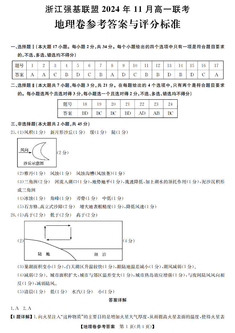 浙江强基联盟2024年11月高一第一学期期中联考 地理答案