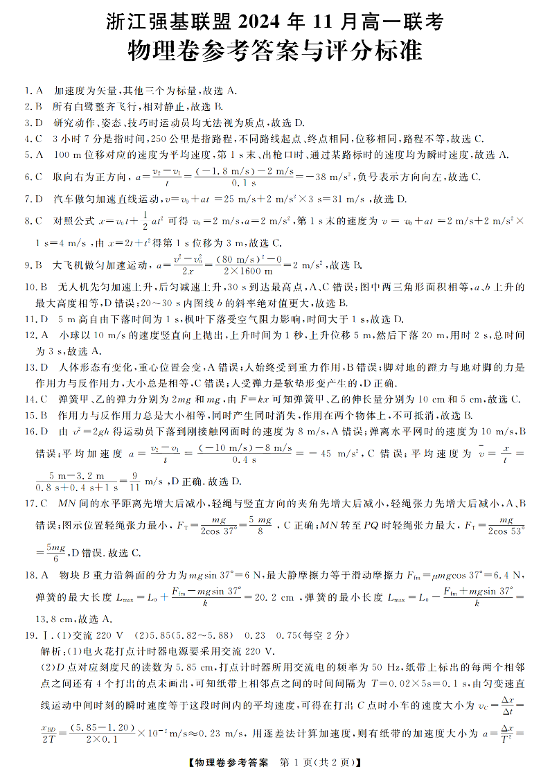 浙江强基联盟2024年11月高一第一学期期中联考 物理答案