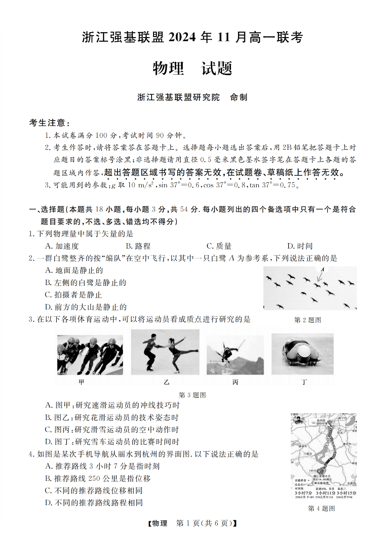 浙江强基联盟2024年11月高一第一学期期中联考 物理