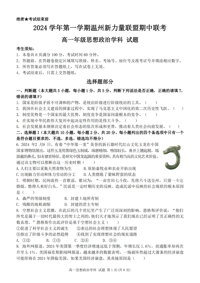 温州新力量联盟2024学年高一第一学期期中联考 政治