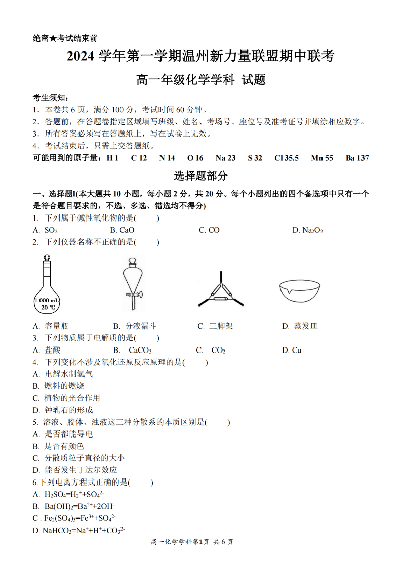 温州新力量联盟2024学年高一第一学期期中联考 化学