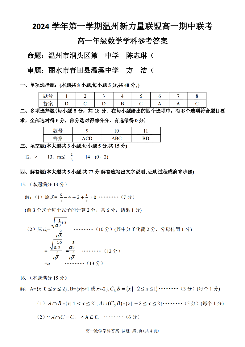 温州新力量联盟2024学年高一第一学期期中联考 数学答案