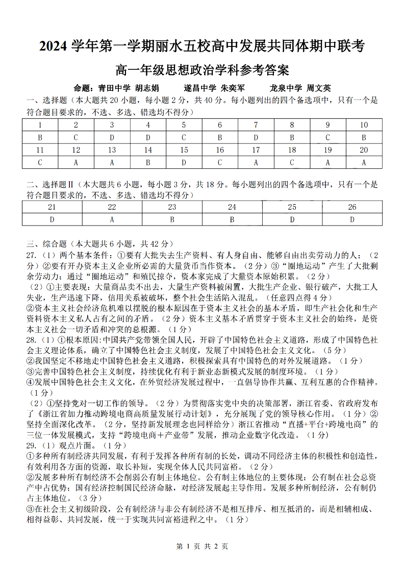 丽水五校高中发展共同体2024学年高一第一学期期中联考 政治答案