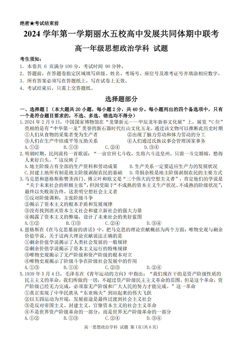 丽水五校高中发展共同体2024学年高一第一学期期中联考 政治