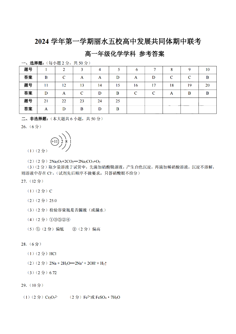 丽水五校高中发展共同体2024学年高一第一学期期中联考 化学答案