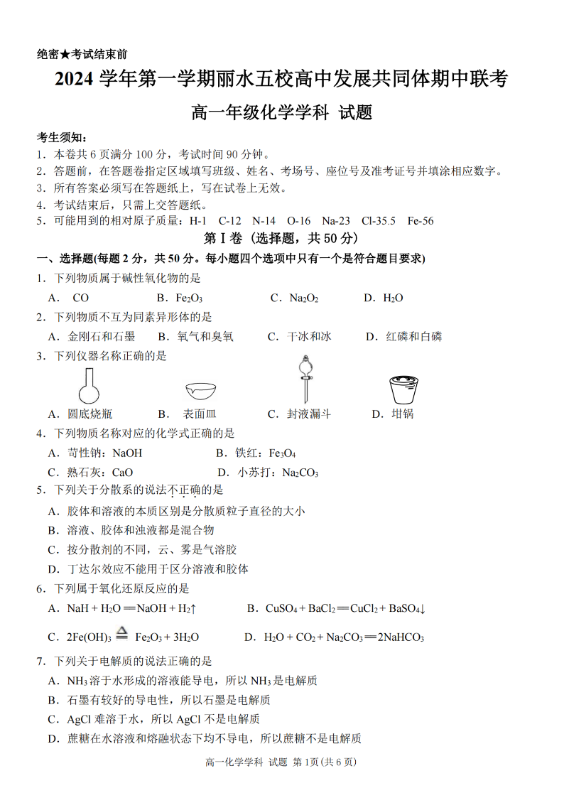 丽水五校高中发展共同体2024学年高一第一学期期中联考 化学