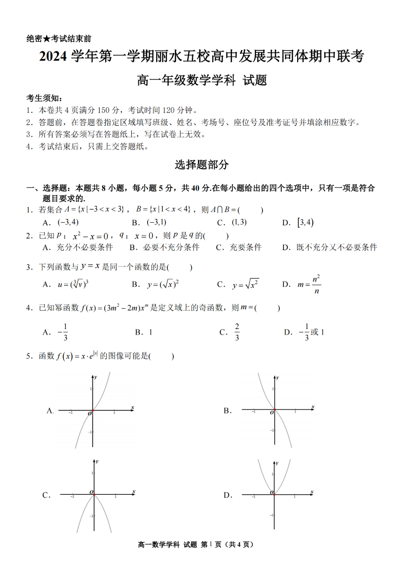 丽水五校高中发展共同体2024学年高一第一学期期中联考 数学