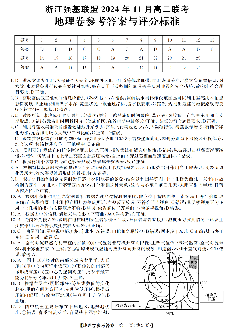 浙江强基联盟2024年11月高二第一学期期中联考 地理答案