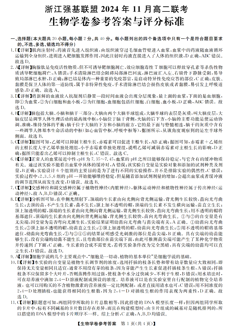 浙江强基联盟2024年11月高二第一学期期中联考 生物答案