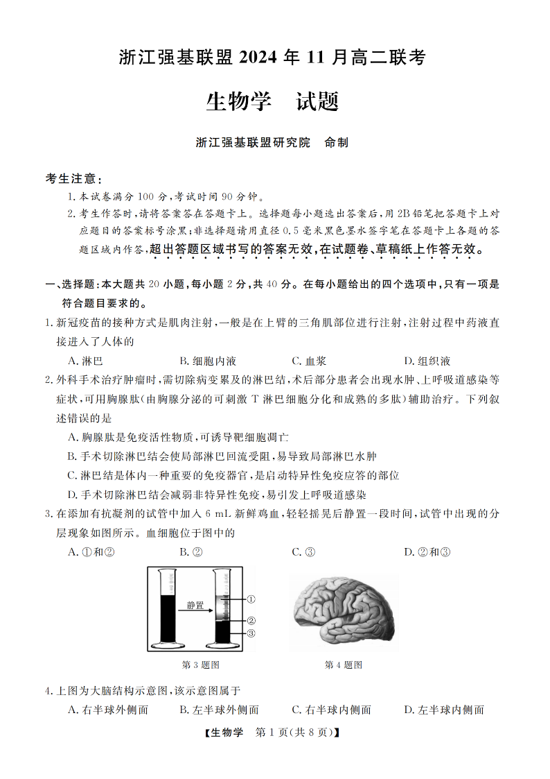 浙江强基联盟2024年11月高二第一学期期中联考 生物