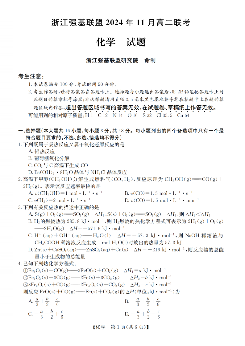 浙江强基联盟2024年11月高二第一学期期中联考 化学