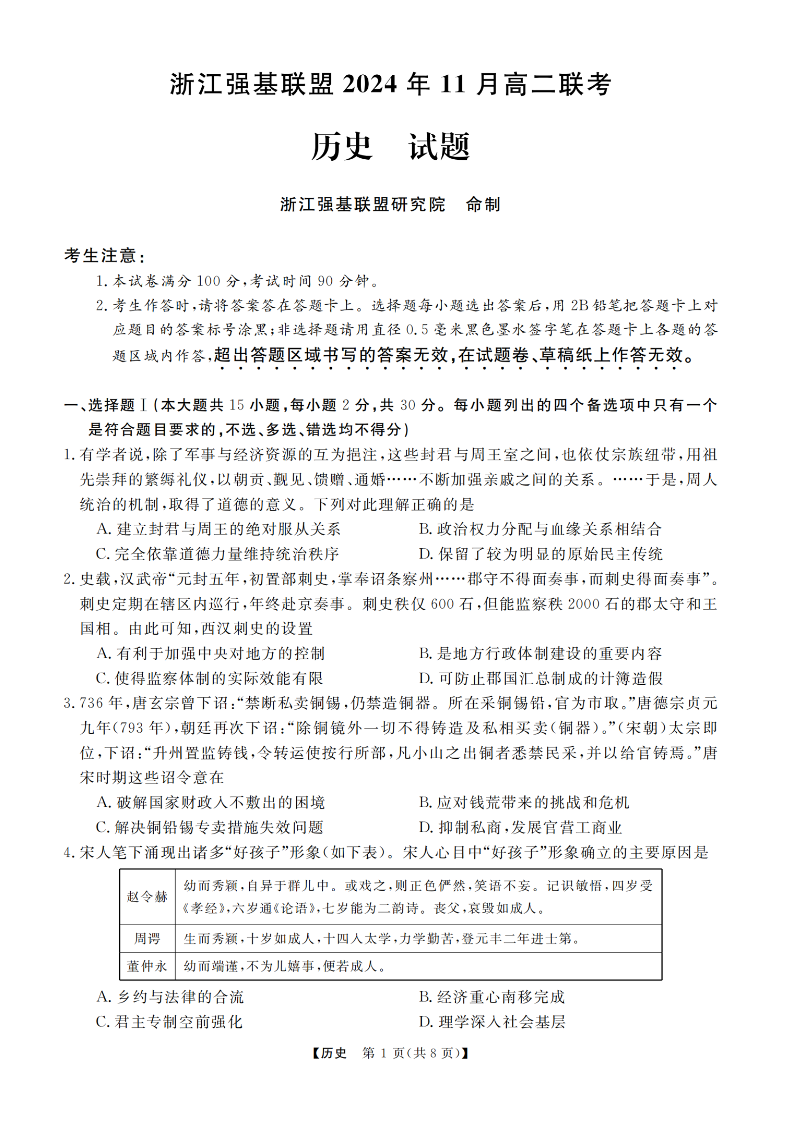 浙江强基联盟2024年11月高二第一学期期中联考 历史