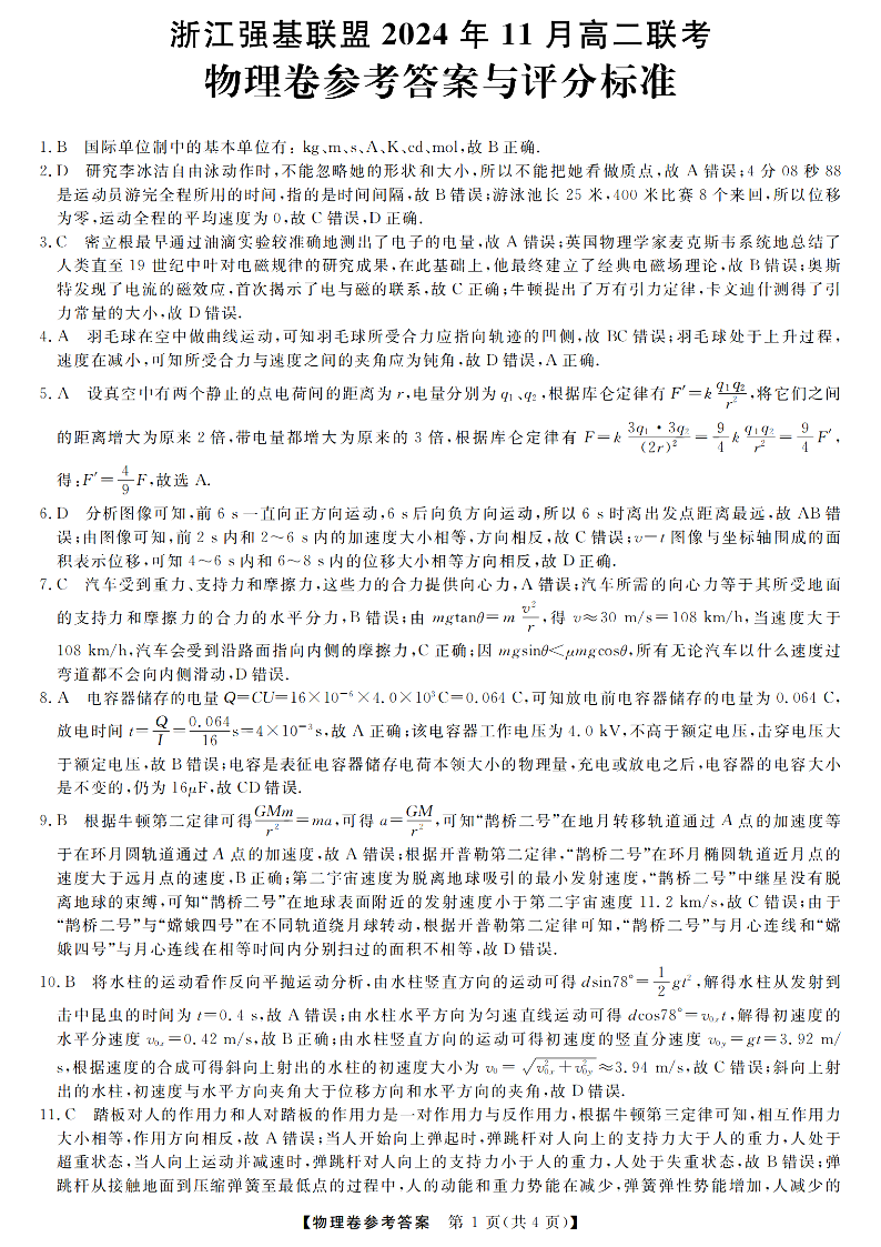 浙江强基联盟2024年11月高二第一学期期中联考 物理答案