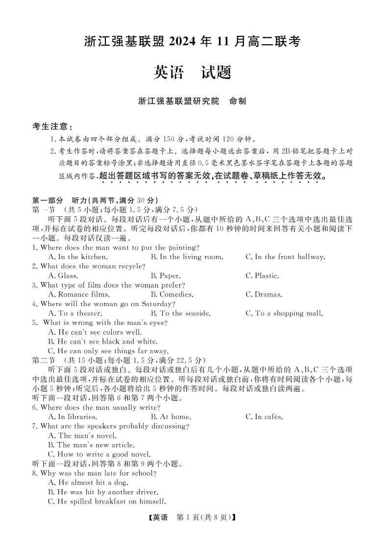 浙江强基联盟2024年11月高二第一学期期中联考 英语