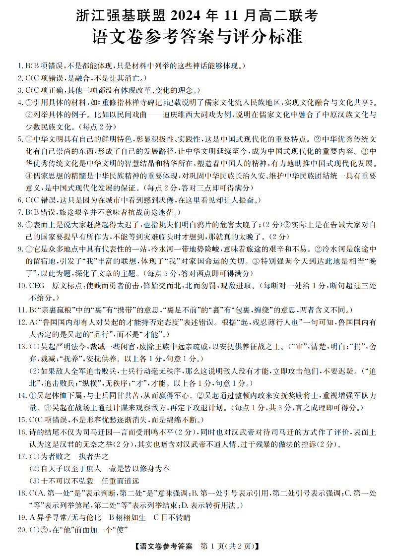 浙江强基联盟2024年11月高二第一学期期中联考 语文答案