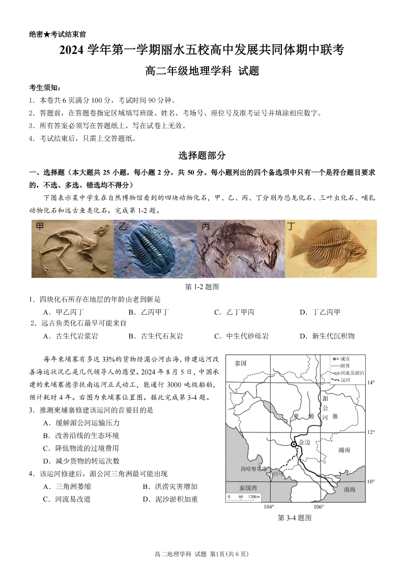 丽水五校高中发展共同体2024学年高二第一学期期中联考 地理