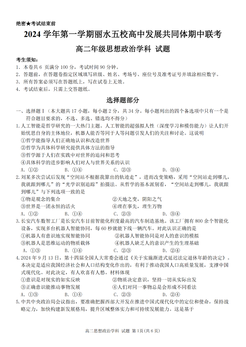 丽水五校高中发展共同体2024学年高二第一学期期中联考 政治