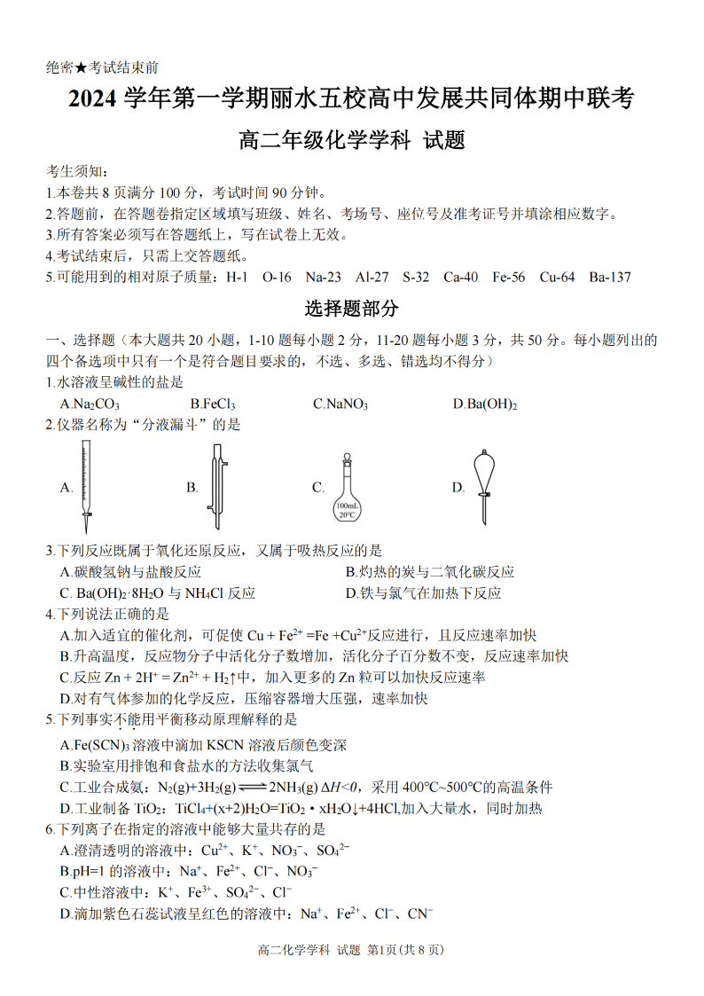 丽水五校高中发展共同体2024学年高二第一学期期中联考 化学