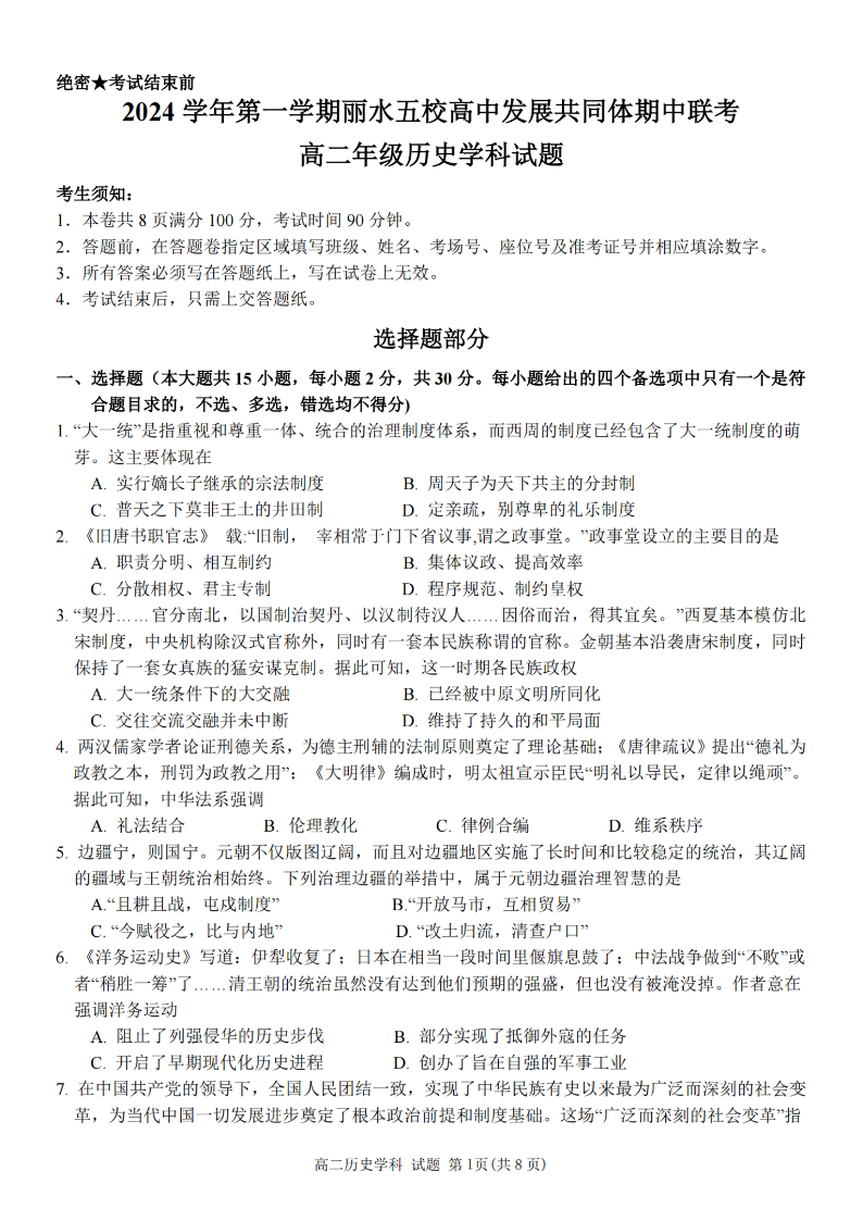 丽水五校高中发展共同体2024学年高二第一学期期中联考 历史