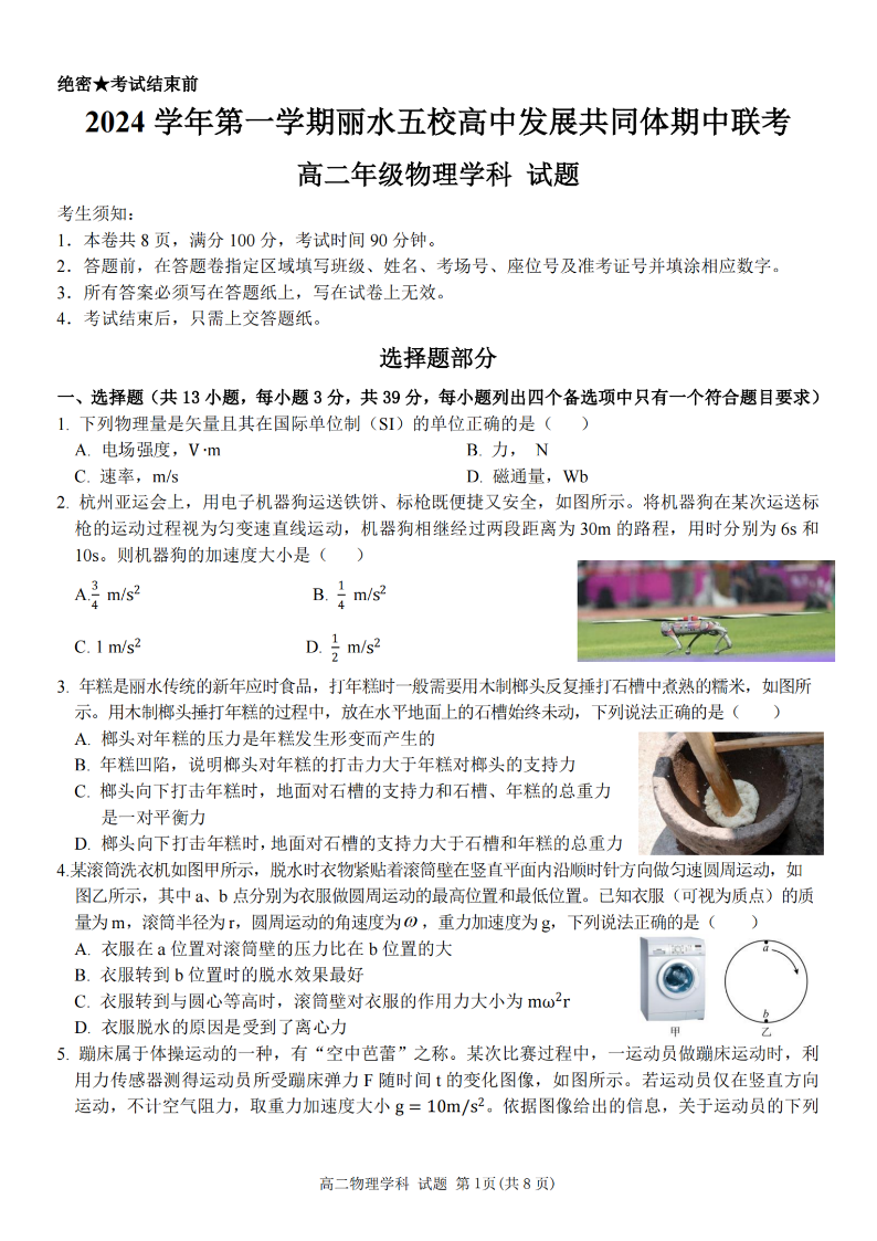 丽水五校高中发展共同体2024学年高二第一学期期中联考 物理