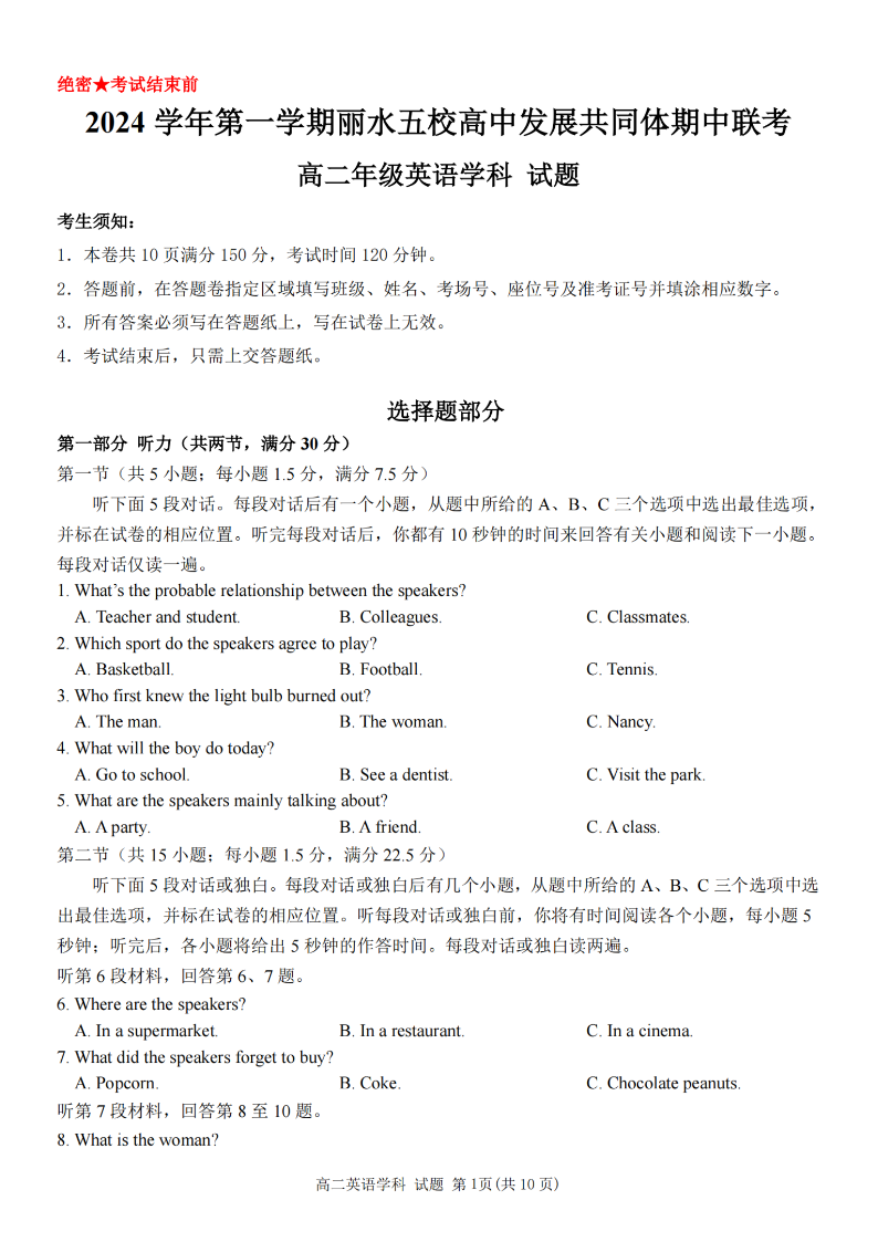 丽水五校高中发展共同体2024学年高二第一学期期中联考 英语