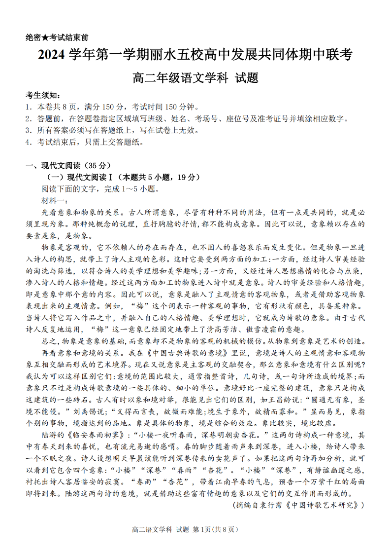 丽水五校高中发展共同体2024学年高二第一学期期中联考 语文