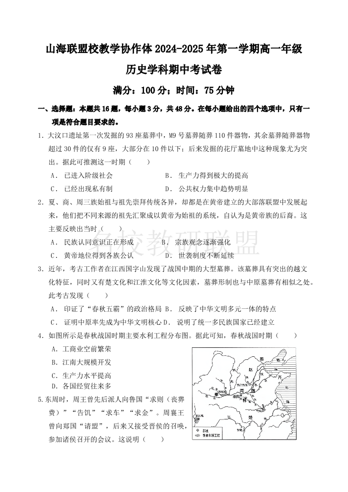 山海联盟校教学协作体2024-2025年度第一学期高一年级期中考试 历史
