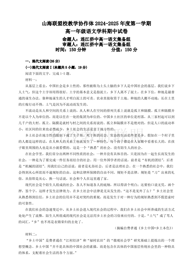 山海联盟校教学协作体2024-2025年度第一学期高一年级期中考试 语文