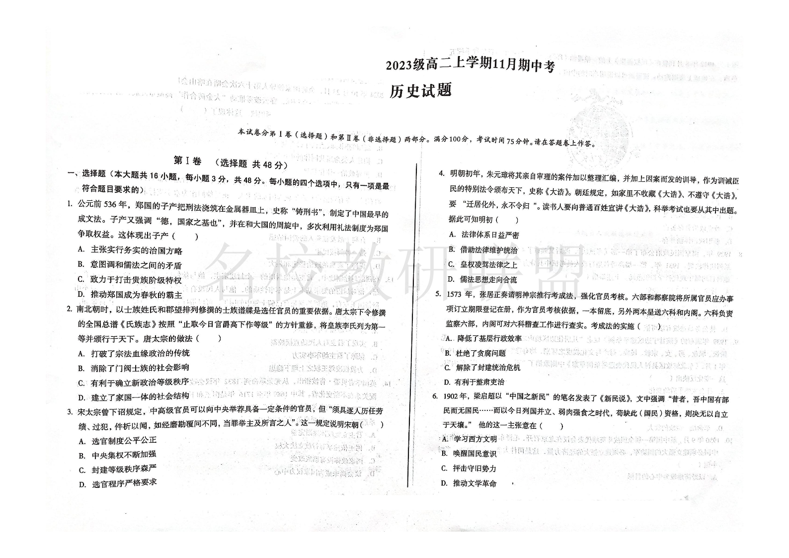 安徽省A10联盟2024-2025学年高二上学期11月期中考试 历史