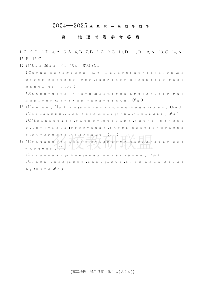 福建省龙岩市非一级达标校2024-2025学年高二上学期期中考试 地理答案