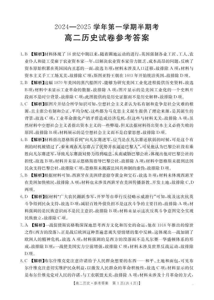 福建省龙岩市非一级达标校2024-2025学年高二上学期期中考试 历史答案