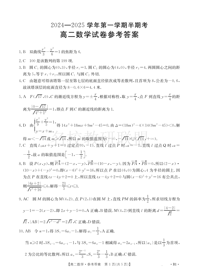 福建省龙岩市非一级达标校2024-2025学年高二上学期期中考试 数学答案