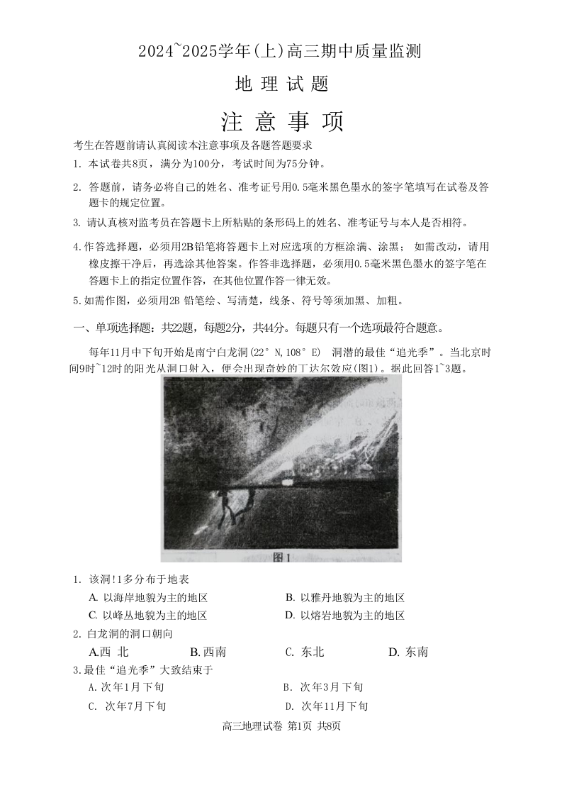 江苏省南通市2024-2025学年(上)高三年级期中教学质量监测考试 地理