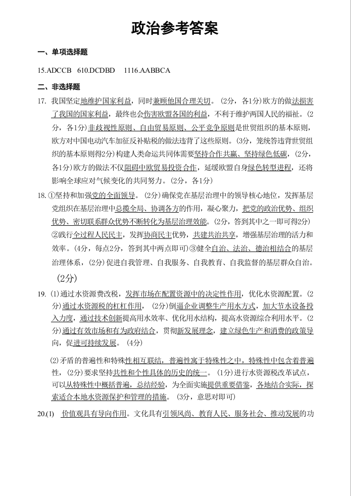 江苏省南通市2024-2025学年(上)高三年级期中教学质量监测考试 政治答案