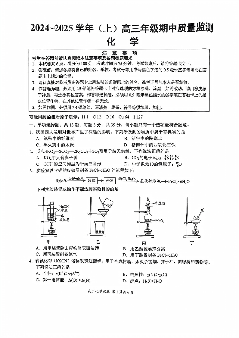 江苏省南通市2024-2025学年(上)高三年级期中教学质量监测考试 化学