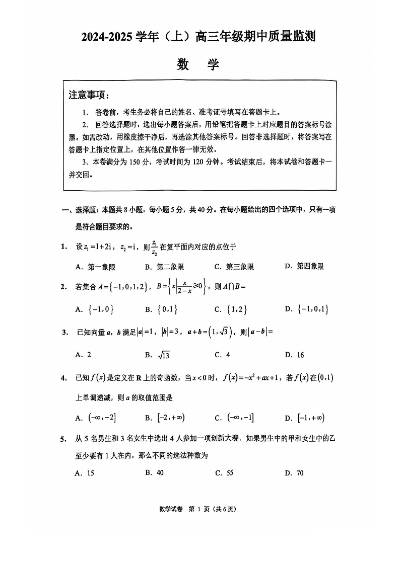 江苏省南通市2024-2025学年(上)高三年级期中教学质量监测考试 数学