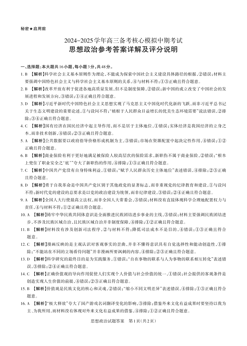 山西省思而行2025届高三备考核心模拟中期考试 政治答案