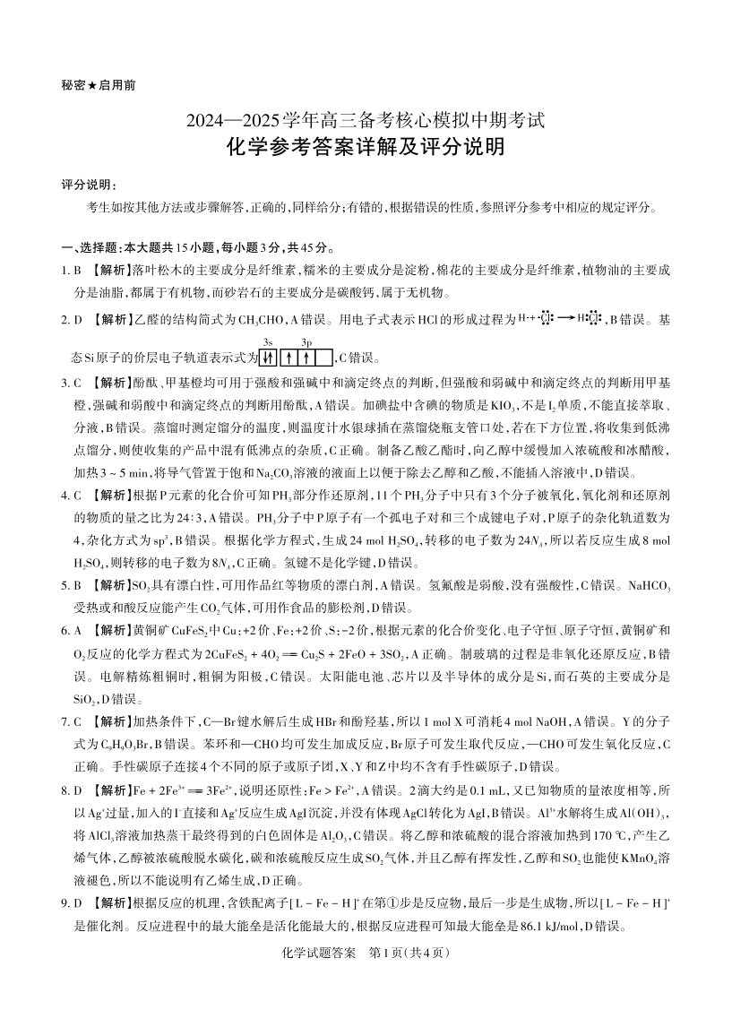 山西省思而行2025届高三备考核心模拟中期考试 化学答案