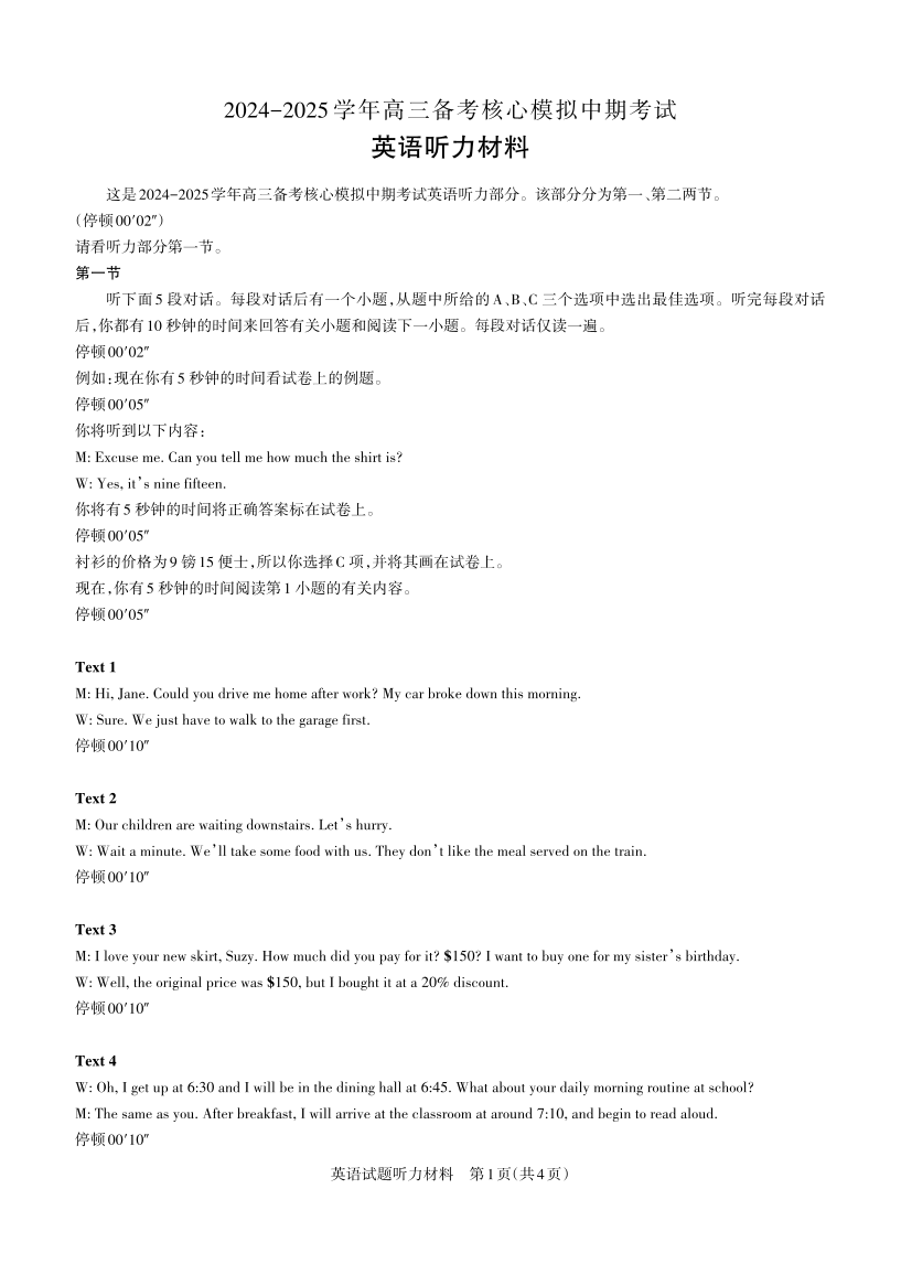 2024-2025学年高三备考核心模拟中期考试英语听力材料
