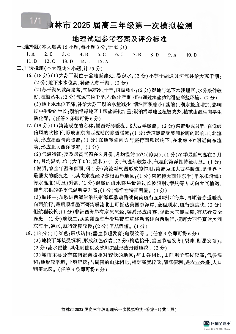 陕西省榆林市2025届高三年级第一次模拟检测 地理答案