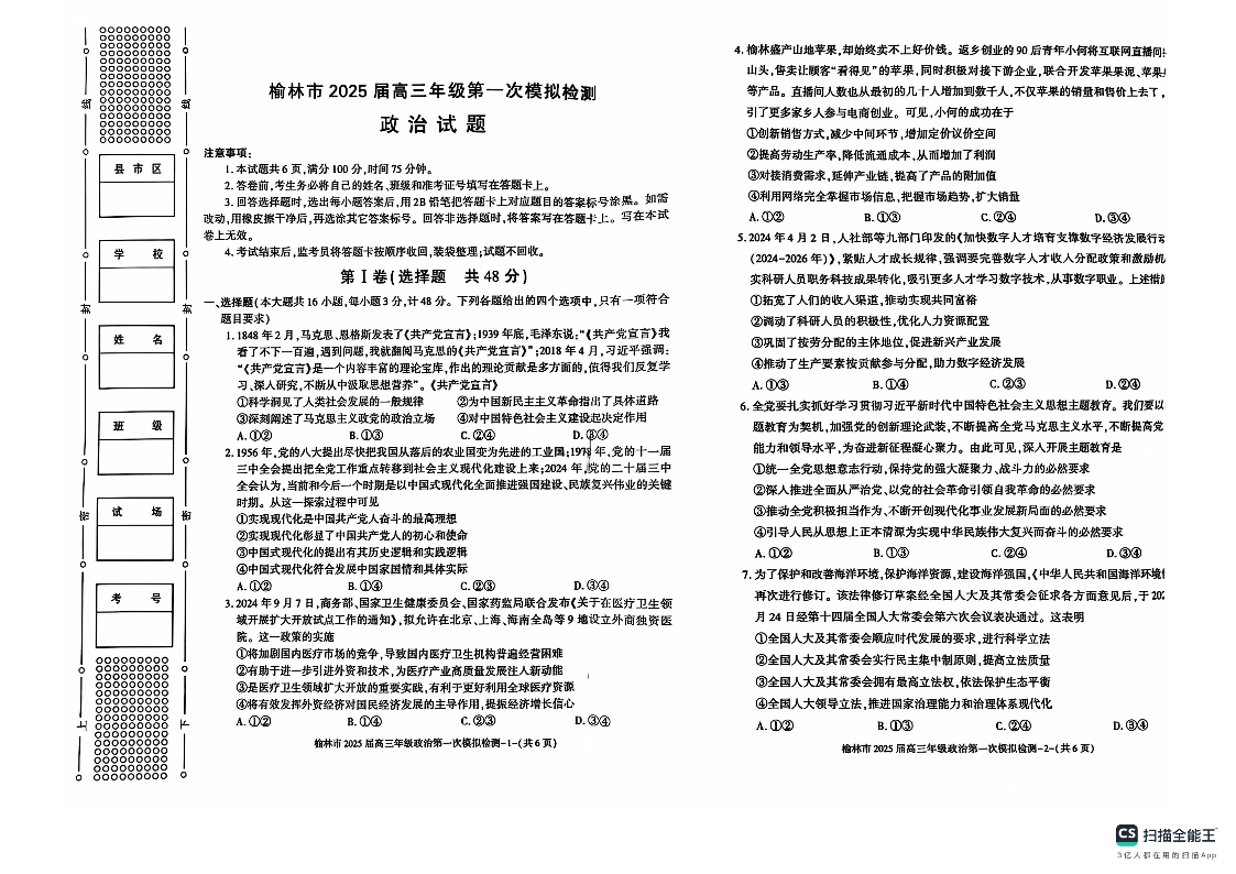 陕西省榆林市2025届高三年级第一次模拟检测 政治