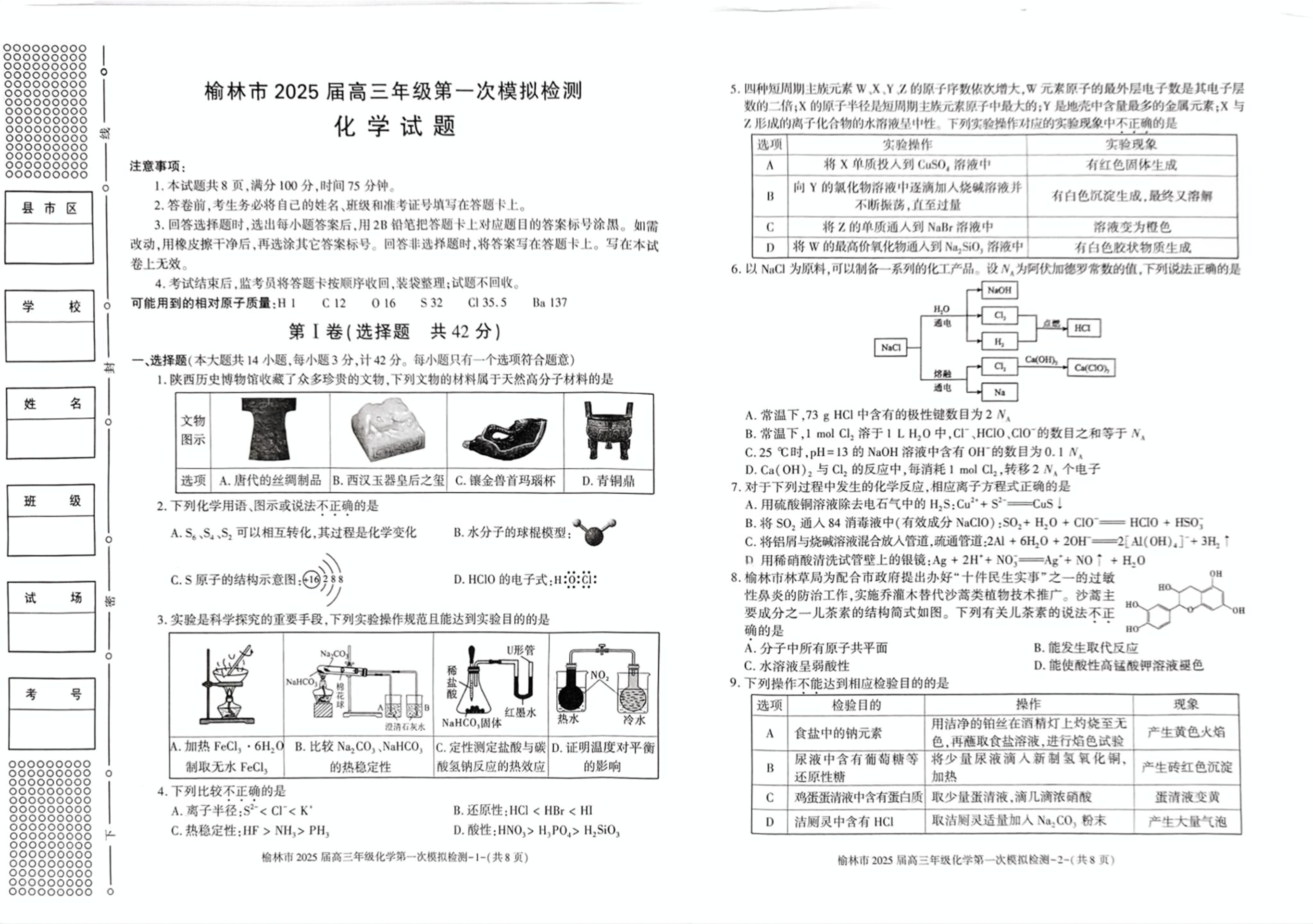 陕西省榆林市2025届高三年级第一次模拟检测 化学
