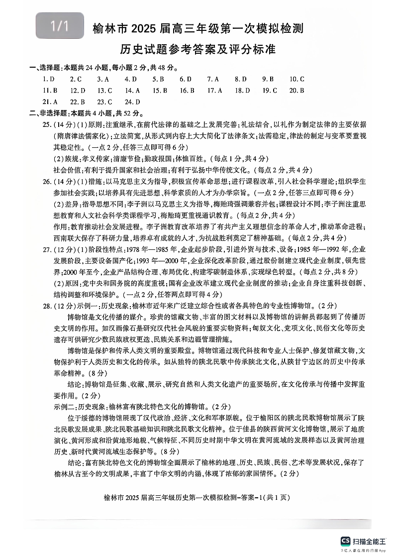 陕西省榆林市2025届高三年级第一次模拟检测 历史答案
