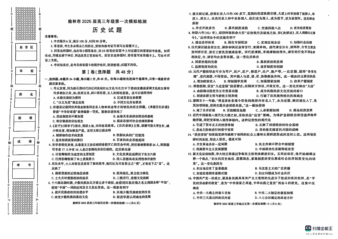 陕西省榆林市2025届高三年级第一次模拟检测 历史