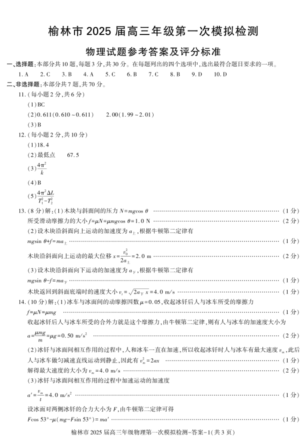 陕西省榆林市2025届高三年级第一次模拟检测 物理答案