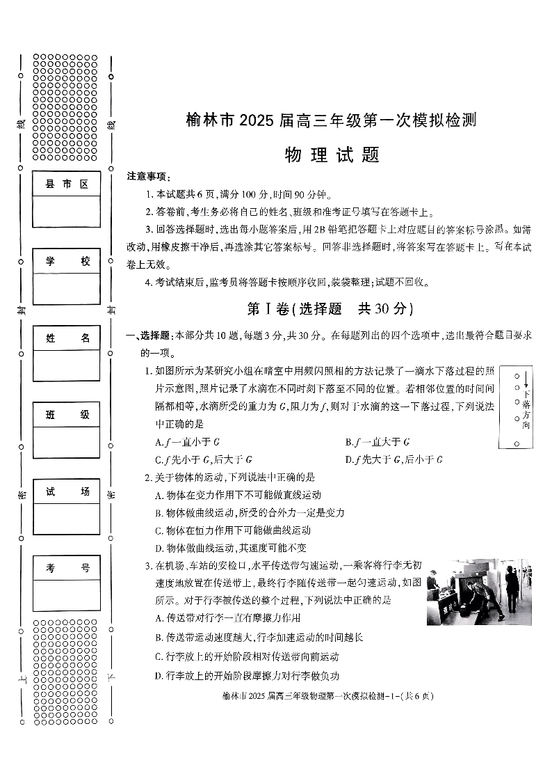 陕西省榆林市2025届高三年级第一次模拟检测 物理